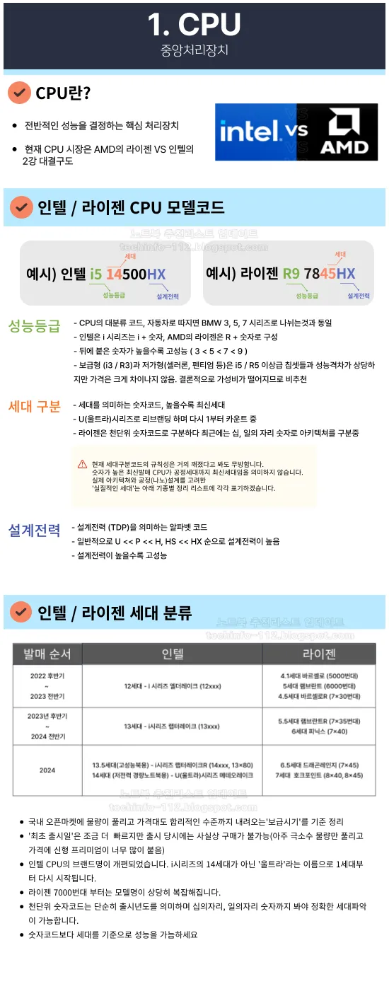 인텔은 i 시리즈 -> 울트라(U) 시리즈 / AMD는 라이젠 -> 라이젠 Ai로 네이밍이 변경되고 있습니다. 게대가 구형 설계공정이 적용된 리프레시 버전 CPU까지 최신 넘버링을 달고 출시하는바람에 CPU의 모델코드만 보고는 세대를 가늠하기 힘들어졌습니다. 더 직관적으로 구분하기 쉽도록 세대를 아래와 같이 조정하여 정리할테니 참고바랍니다.