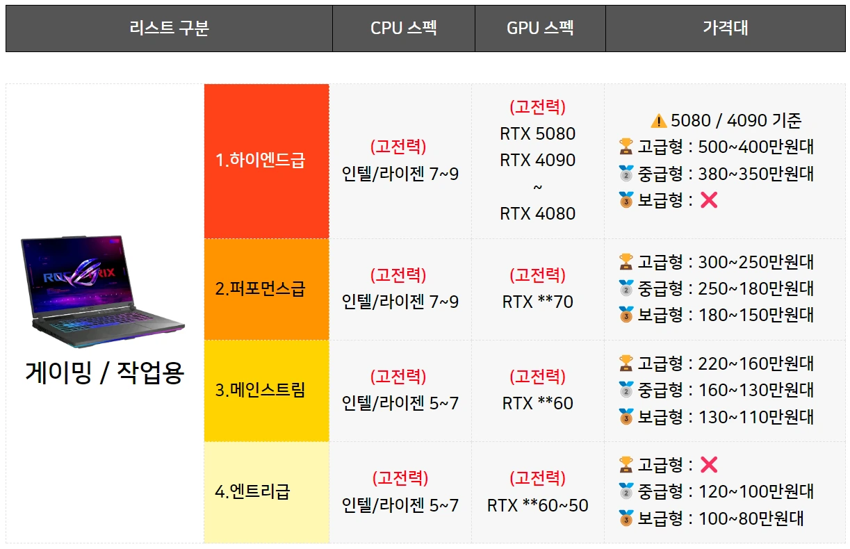 | 🏆고급형 기종 | 💵600~ 500만원대 (RTX5090 기준) 💵500 ~ 400 만원대 (RTX5080 / 4090 기준) ⚠️가격대가 미친듯이 높아지는 스펙구간입니다. 차라리 데스크탑 구매를 권장합니다. |